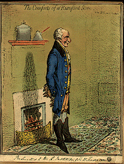 Un disegno che mostra Rumford scaldarsi davanti ad un suo caminetto.