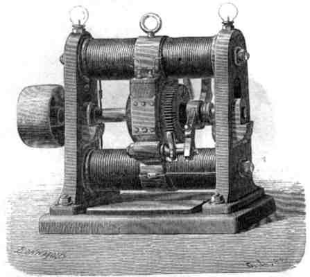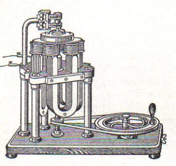 In essa, anziché avere le variazioni di flusso di campo magnetico al di sotto dei poli magnetici, la si originava a fianco del magnete permanente A mediante due bobine B e B’ messe in rotazione da un sistema a manovella R. Si può notare che a e b sono i due contatti striscianti che lavorano su un commutatore (se così non fosse non si avrebbe l’elettrolisi dell’acqua come mostrato nella figura piccola a lato nella quale la corrente prodotta viene convogliata ad un voltametro). Tale macchina era essenzialmente utilizzata in laboratori scientifici perché poteva fornire corrente in modo più economico (ed a maggiore intensità) delle pile. Ma se ne vendevano molte per le solite e mai finite manie terapeutiche: il paziente prendeva i terminali elettrici e qualcuno azionava la manovella. La quantità di corrente che avrebbe dovuto alleviare le pene dei pazienti poteva essere variata variando la velocità di rotazione della manovella.