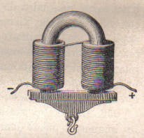 Elettromagnete a ferro di cavallo, il primo efficiente dei quali fu realizzato da Sturgeon. Si è ora utilizzata una barra di ferro piegata ad U con due avvolgimenti di rame alle due estremità. In questo caso il rame deve essere avvolto in versi opposti nei due poli. La prima figura è relativa al semplice elettromagnete, la seconda dispone di un pezzo di ferro disposto tra i due poli che ha la funzione di chiudere il circuito magnetico