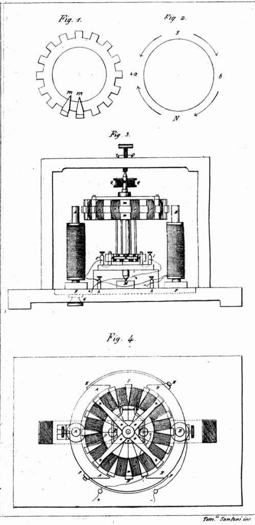 Ho trovato molto vantaggioso l’ aggiungere ai due poli della elettro-calamita fissa due armature di ferro AAA, BBB dolce delle quali ciascuna abbraccia per più di un terzo di cerchio la ruota che costituisce la elettro-calamita trasversale, ponendole assai prossime ai denti della medesima, e collegandole fra loro con delle guide d’ottone EE, EE, come si vede nella proiezione orizzontale (f ig. 4). Queste armature non sono state disegnate nella proiezione verticale (fig. 3) della macchina perchè avrebbero occultati troppo i rocchetti e i denti della ruota. La macchina agisce anche quando la corrente passa solo per l’elettro calamita circolare, ma ha assai meno forza che quando la corrente passa anche per l’elettro calamita fissa.