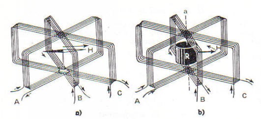 In essa un magnete che ruota trascina un ago magnetico. Si suole dire che il magnete genera un campo magnetico rotante. L’esperienza mostra che un tale campo magnetico rotante si può ottenere anche facendo passare le tre fasi di una corrente trifase in tre bobine distinte disposte tra loro a 120° come rappresenta la figura seguente perché, se