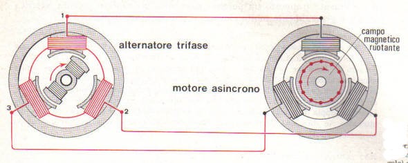 nel centro si pone un ago magnetico, si vede che questo ruota come nell’esperienza precedente. Ciò avviene a seguito dei fenomeni d’induzione di ciascuna delle tre bobine. Se ora disponiamo di un alternatore trifase (o anche bifase) che alimenta un motore costituito dalle bobine di induzione magnetica, queste ultime generano, nello spazio che corrisponde a quello in cui ruota l’induttore dell’alternatore, campi magnetici variabili e alternati, che si compongono in un campo risultante simile a quello di detto induttore, cioè rotante. Se la frequenza delle correnti è 50 Hz, il campo rotante compie 50 giri al secondo. Ogni circuito chiuso, collocato in modo da essere investito da questo flusso rotante, diventa sede di correnti indotte, che si manifestano con un effetto meccanico, l’azione di una coppia di forze, perché l’indotto si oppone alle variazioni del flusso (legge di Lenz) partecipando alla sua rotazione. Un indotto girevole attorno a un asse, viene messo in rotazione dalla coppia, con un momento tanto più forte quanto più grande è la differenza fra la velocità di rotazione del campo e quella dell’indotto (cioè la velocità relativa del rotore rispetto al campo rotante).
