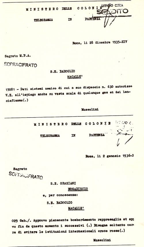 «Durante lo svolgimento delle operazioni culminate nell’occupazione di Addis Abeba nel maggio 1936, da parte di nostre squadriglie da bombardamento furono lanciate bombe ad yprite nel settore Nord e bombe ad yprite e fosgene nel settore Sud (Somalia) dell’ Africa Orientale. L’impiego fu più intenso nel settore Nord.
