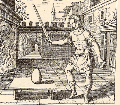La rottura dell’uovo filosofale (il vaso di Ermete) con la spada (fuoco) originerà il pulcino (pietra filosofale).
