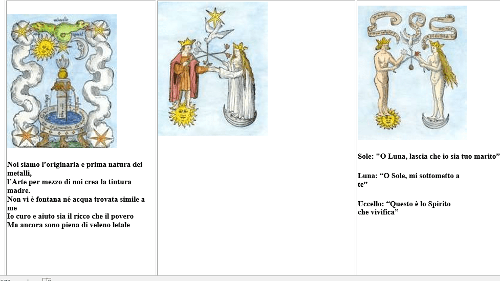 “… nostro portinaio, nostro balsamo, nostro miele, olio, rugiada di maggio, madre, uovo, segreta fornace, fuoco vero, dragone velenoso, vino ardente, leone verde, uccello di Ermete, oca di Ermogene, spade affilate in mano al cherubino che custodisce l’Albero della Vita … è la nostra verità, il vaso segreto, il giardino dei Saggi nel quale il Sole sorge e tramonta”.