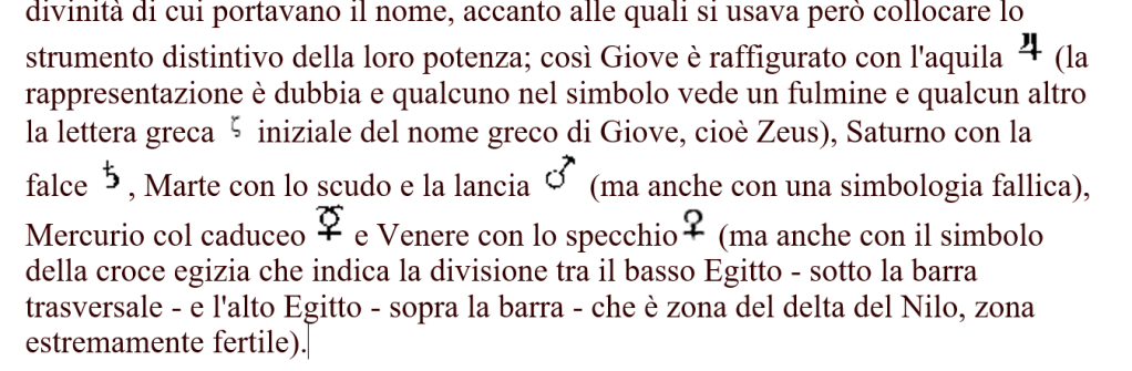 (2) Vi è anche un’altra particolare considerazione da fare relativamente, ad esempio, a Giove e Saturno; se si osservano i rispettivi simboli si scoprirà che somigliano ai numeri 4 e 5 della numerazione araba che veniva introdotta in Occidente, che sono proprio i pianeti 4 e 5 del sistema aristotelico-tolemaico. I pianeti . I pianeti furono comunque sempre rappresentati con le immagini delle