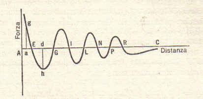 Verso la metà del secolo il padre gesuita Giuseppe Ruggero Boscovich (1711 -1787) elaborò una sintesi fisica estremamente complessa ed articolata. Egli partì con una critica alla teoria corpuscolare della materia fatta da Newton (Theoria Philosophiae naturalis theoria redacta ad unicam legem virium in natura existentium, 1758) affermando di voler presentare un sistema che è a mezza strada tra quello di Leibniz e quello di Newton (così come, nello stesso periodo, Kant tenterà di costruire una via intermedia tra i cartesiani ed i leibniziani). Secondo Newton le particelle costituenti la materia sono dotate di dimensioni e, a distanze piccolissime, esse si attraggono; secondo Boscovich le forze che si esercitano a corto raggio dovevano essere repulsive. Infatti, considerando l’urto fra due palline, queste, nell’istante in cui si incontrano presentano una variazione discontinua della loro velocità. Estendendo il ragionamento ai corpuscoli costituenti la materia Boscovich concluse che questa discontinuità non poteva essere accettata. Secondo Boscovich, quindi, le particelle non hanno dimensioni ma debbono considerarsi come punti inestesi, inoltre esse non vengono mai a contatto. Questi «punti» sono soggetti alle tre leggi della dinamica e tra essi si esercitano delle forze che sono alternativamente attrattive e repulsive al variare della distanza tra i «punti». La legge con cui varia questa forza è rappresentata nella figura seguente (si osservi che tale grafico deve essere concepito tridimensionalmente: si pensi ai vari strati che compongono una cipolla come alle curve di forza che circondano un «punto»). Per distanze piccolissime si ha sempre
