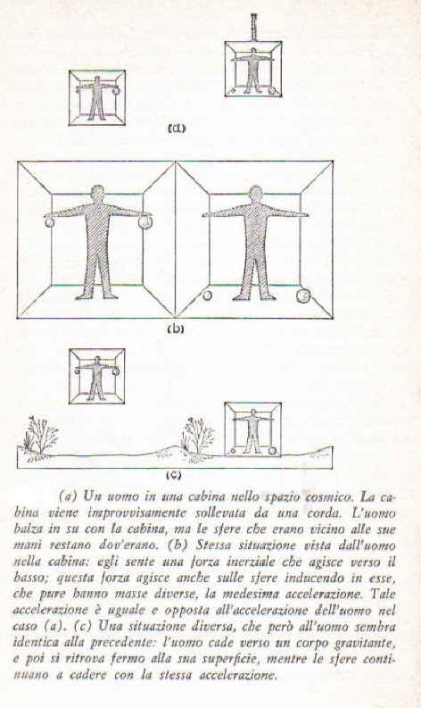 Einstein illustrava questo stato di cose nel modo seguente: consideriamo un uomo chiuso in una cabina d’ascensore posta in qualche punto dello spazio molto lontano da forze gravitazionali, e supponiamo che la cabina venga improvvisamente sollevata da una corda, in modo che presenti un’accelerazione rispetto a un sistema inerziale (fig. a). L’uomo dentro la cabina può scegliere di considerare se stesso in quiete nel corso dell’esperimento, ma allora la cabina diventa un sistema di riferimento non inerziale, e di conseguenza agirà su di essa una forza inerziale (fig. b). L’esistenza di una forza del genere risulterà ovvia