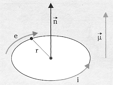 Nella figura e è la carica dell’elettrone orbitante a velocità v; i = e/t (dove t è il tempo) è la corrente dovuta alla carica dell’elettrone rotante; r è il raggio dell’orbita; n è la normale al piano dell’orbita; μ è il momento magnetico orbitale dell’elettrone che è un vettore che in modulo vale μ = eS/t, dove S = πr2 è l’area racchiusa dalla traiettoria dell’elettrone e t il tempo impiegato a percorrere la traiettoria (è diretto verso l’alto perché il verso di rotazione dell’elettrone è quello orario; se l’elettrone si muovesse in senso antiorario μ sarebbe diretto verso il basso). Se ci si riferisce al periodo T = (2πr)/v, la quantità μ sarà data da μ = eS/T.