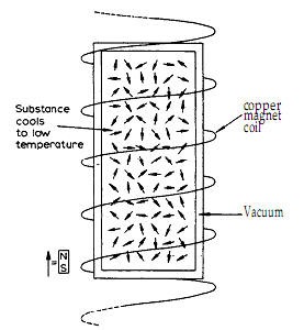 Alla temperatura di 1°K non debbono più esservi vibrazioni atomiche ed è quindi possibile intervenire sull’orientamento degli spin. Vediamo il modo di procedere per raggiungere il risultato (seguo il lavoro di Giaugue tratto dalla sua Nobel Lecture del 1949). Il sale paramagnetico, che è alla temperatura di 1°K dell’elio liquido che lo raffredda, viene messo all’interno di un intenso campo magnetico ottenuto con un avvolgimento di spire (il tutto deve essere perfettamente isolato dall’ambiente esterno).