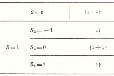 e se gli spin fossero stati classici il prodotto scalare tra i due vettori s1.s2 per spin paralleli ed antiparalleli si sarebbe differenziato per il solo segno risultando uguali ad s2 = ± 1/4]. Tra i due stati caratterizzati da S = 0 ed S = 1 vi è una importante differenza: lo stato con S = 0 è unico e si chiama perciò singoletto; vi sono invece tre eventualità con S = 1 e tale stato si chiama tripletto (con gli spin diretti nello stesso verso, S = 1 si ottiene in tre modi, come mostrato nella tabella seguente):