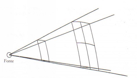 Per Keplero la luce viaggia dalla sorgente a distanze infinite, viaggia in linea retta (si muove secondo un infinito numero di linee rette che si chiamano raggi) con velocità infinita (essa non si muove nel tempo ma all’istante) e viene immaginata come una superficie di inviluppo delle estremità dei singoli raggi (una sorta di prefigurazione del fronte d’onda) che in se stessi non hanno consistenza fisica e quindi sono analoghi a traiettorie di corpi in movimento. La luce si muove lungo i singoli raggi ma questi non si muovono e neppure sono luce ma solo linee rette nello spazio comode per la nostra descrizione del fenomeno. Ciò che si muove sono delle superfici perpendicolari ai raggi come mostrato in figura. E la figura mostra anche la legge dell’inverso del quadrato, il fatto cioè che, al raddoppiare la distanza da una fonte di luce, la sua intensità diventa un quarto di quella che si aveva a distanza uno (proprio perché tutta la