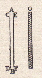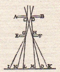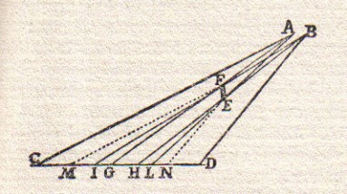 I punti A e B rappresentano due punti sul bordo di un piccolo forellino fatto su una parete, foro dal quale entra della luce in una stanza buia. Invece FE rappresenta un piccolo oggetto che si trova nella traiettoria dei raggi luminosi provenienti dal forellino. CD è invece il pavimento bianco della stanza oscura. Se non vi fosse FE, su CD vedremmo l’immagine del foro deformata in una circonferenza più o meno schiacciata. Intorno a questa immagine illuminata vi sarebbe una zona di penombra. Ora Grimaldi fa una interessante discussione nella quale sostiene (non è una cosa da poco, come vedremo in Huygens) che ogni punto del bordo del foro deve essere considerato come emettente luce. In particolare la luce viene emessa sia da A che da B. Quindi, se non vi fosse FE, la luce proveniente da A costruirebbe un cono di luce ACL e la luce proveniente da B un cono BID. Quando inseriamo il piccolo oggetto FE, poiché i raggi di luce viaggiano in linea retta, la luce proveniente da A deve provocare l’ombra GL e quella proveniente da B un’ombra IH. In definitiva si dovrebbe avere una zona in ombra GL con una zona più scura GH al centro della prima. L’esperienza non dà questo risultato: