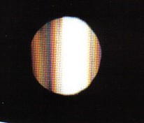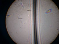 a lato dell’oggetto opaco X (il bordo di un ostacolo) vi sono una serie di bande luminose (frange) che vanno stringendosi e perdendo luminosità man mano che ci si sposta verso l’esterno. La cosa più interessante e che Grimaldi nota è che i bordi di tali frange sono colorati! sono di un colore tendente all’azzurro verso l’interno dell’ombra e di un colore rossastro verso l’esterno dell’ombra. Nella figura seguente è mostrata una figura di diffrazione alla Grimaldi: un filo metallico illuminato (la striscia bianca centrale) da un tenue raggio di luce origina le frange di diffrazione a destra e (maggiormente visibili) a sinistra del filo.