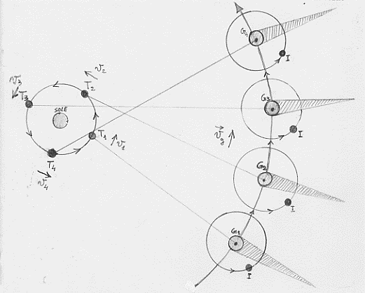 La situazione astronomica alla base della sua esperienza è illustrata, in figura (dove T1 , T2, …, sono successive posizioni della Terra nella sua orbita intorno al Sole cui competono, rispettivamente, le velocità v1,v2, …; analogamente G1,G2, …sono successive posizioni di Giove nella sua orbita intorno al Sole cui competono le velocità vg, infine I rappresenta il satellite di Giove, Io). La prima cosa da dire è che il piano dell’orbita di Io intorno a Giove coincide con quello dell’orbita di Giove e della Terra intorno al Sole. Stando