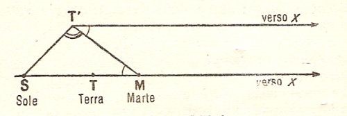 Vediamo ora come si procede per il calcolo della distanza Terra-Marte, riferendoci alla figura seguente e prendendo sempre come unità la distanza Terra-Sole.