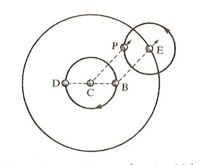 Da M. Boas. Nel sistema copernicano C è il Sole centro del sistema; B è la Terra; E un pianeta esterno. Nel sistema tolemaico C è la Terra; D è il Sole; E il centro dell’epiciclo del pianeta; P il pianeta. La linea che congiunge la Terra al pianeta, nel secondo caso, sarà parallela alla linea che congiunge la Terra al pianeta nel primo caso. L’angolo tra questa linea e la linea Terra-Sole sarà lo stesso in entrambi i sistemi. Di conseguenza la posizione apparente del pianeta è la stessa.