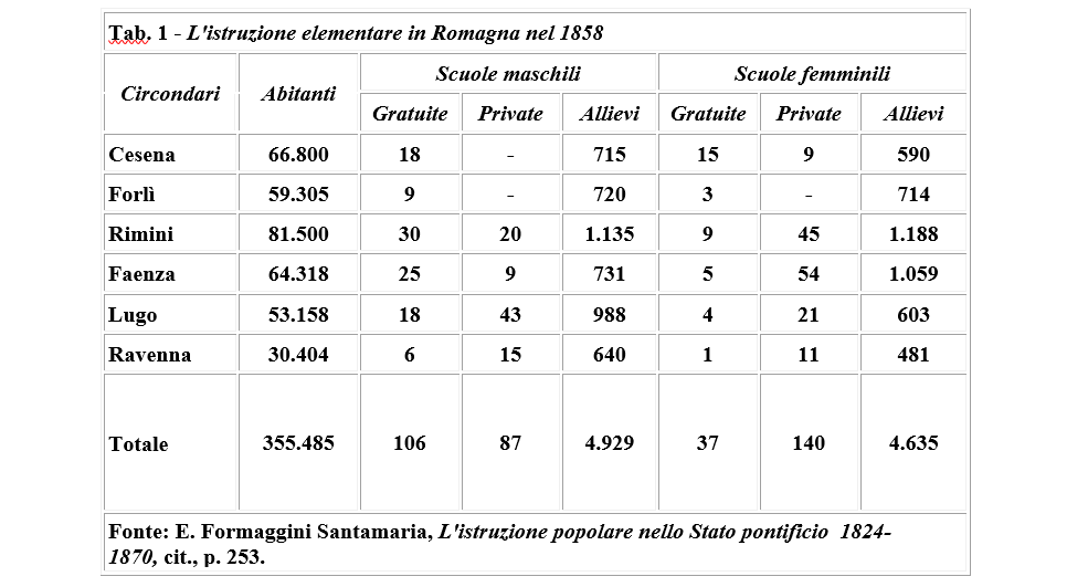 Con la Restaurazione, lo Stato Pontificio si era riprese le Marche e la Romagna. Quindi anche in zone dove si era fatto un qualche passo avanti si ritornò indietro. Aveva iniziato (1816) Pio VII a ridare il monopolio dell’educazione ai gesuiti con il fine di creare delle coscienze passivamente obbedienti alla Chiesa. Le scuole primarie (parrocchiali) gratuite erano molto poche, le paghe ai maestri erano ridicole, si insegnavano nozioni strumentali con l’esclusione della storia profana e di ogni scienza. Vi erano poi scuole regionarie private a pagamento (che saranno regolate nel 1825). Inoltre molte attività caritatevoli private insegnavano a leggere ed il catechismo (e lavori femminili alle giovanette, ma non a leggere; chi avesse voluto farlo doveva chiedere dispensa alla parrocchia). Nel 1819 si iniziò (Pesaro e Spello) l’esperienza del mutuo insegnamento (vedi oltre).