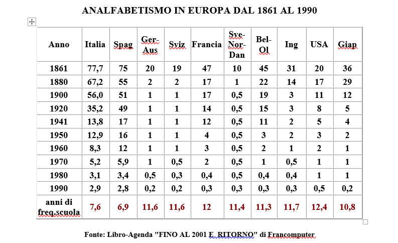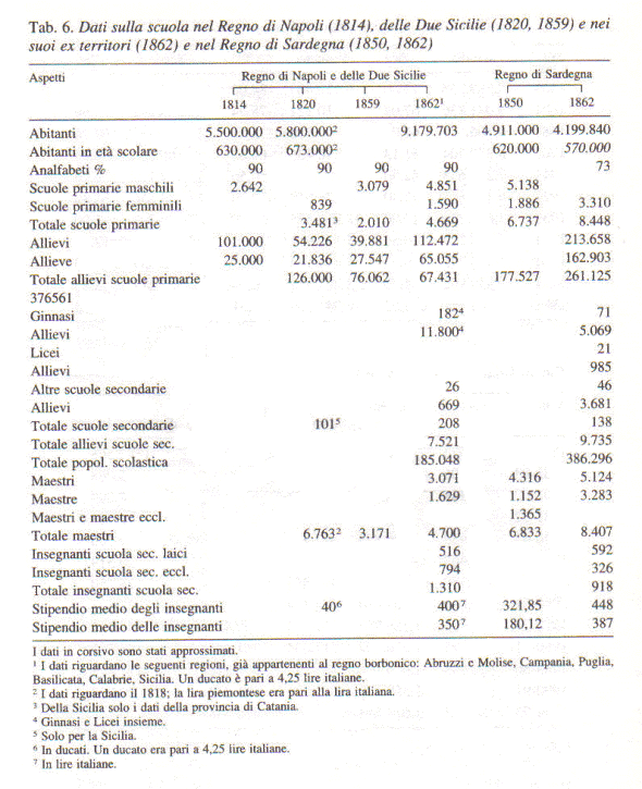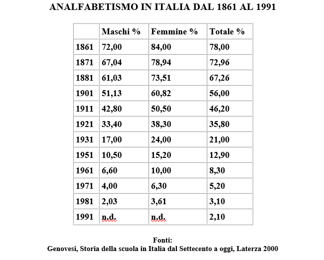Fonte: Giovanni Genovesi – Storia della scuola in Italia dal Settecento ad oggi – Laterza 2000.