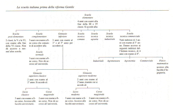 propedeutico dopo la scuola elementare (in pratica la sua durata era di 6 anni senza possibili accessi universitari). Vi erano poi gli istituti nautici, anch’essi inseriti tra le scuole secondarie. Vi erano infine le scuole tecniche in senso stretto (comune, agraria, industriale, commerciale) della durata di tre anni. Tra queste solo l’ultima prevedeva l’accesso ad un quarto anno di specializzazione (su cosa non si capì mai). Tra le specializzazioni, solo quella fisico-matematica permetteva l’accesso all’università, solo ad ingegneria attraverso un biennio di matematica.