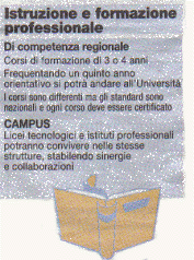 | CICLI ISTRUZIONE | Riorganizzazione complessiva del sistema di istruzione, con un percorso dai 5 ai 18 anni, articolato in due cicli: il primo fino ai 12 anni, il secondo dai 12 ai 18. Obbligo scolastico fino ai 15 anni, diritto formativo fino a 18. | Legge n. 30 del 10/2/2000 (Legge-quadro sul riordino dei cicli scolastici) |