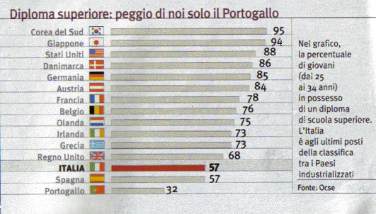 Occorre aggiungere un altro dato, che sarà abbondantemente utilizzato come strumento di propaganda per giustificare la frenesia riformista. Verso la metà degli anni 90 circolavano ormai numerose statistiche che vedevano l’Italia agli ultimi posti in Europa per numero di diplomati a livello secondario (e per numero di laureati). Il problema