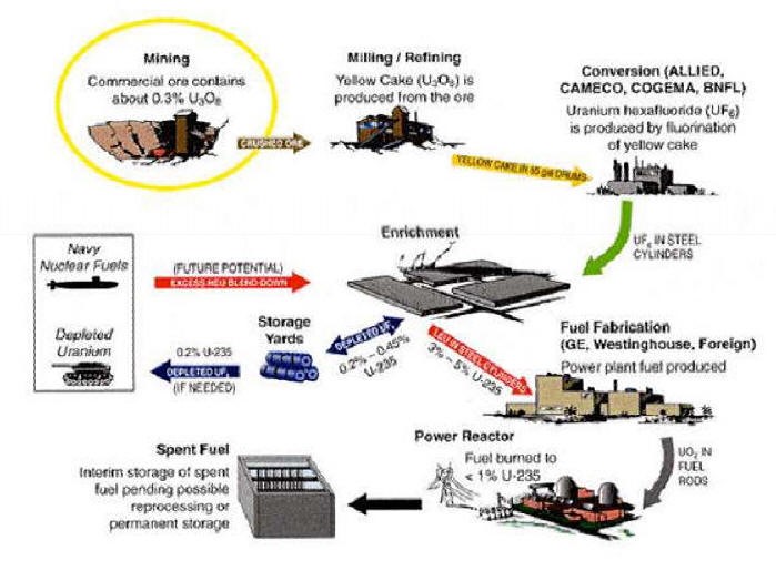 La preparazione del “fuel” nucleare dalla miniera al suo impiego nel reattore è detto nuclear fuel cicle. Questo tipo di ciclo, senza però la fase di reprocessing, è quello attuato nella maggior parte dei paesi che hanno centrali nucleari tipo LWR, perché il passaggio del reprocessing è costoso e in cui si separa il Pu che potrebbe venire usato militarmente. Il minerale estratto viene macinato per ottenere il “yellow coke” che contiene l’80% di U3O8 . La conversione in UF6 , che è gassoso a relativamente bassa temperatura e pressione, serve per il passaggio successivo di arricchimento. Più in dettaglio il ciclo del combustibile è quello di figura seguente: