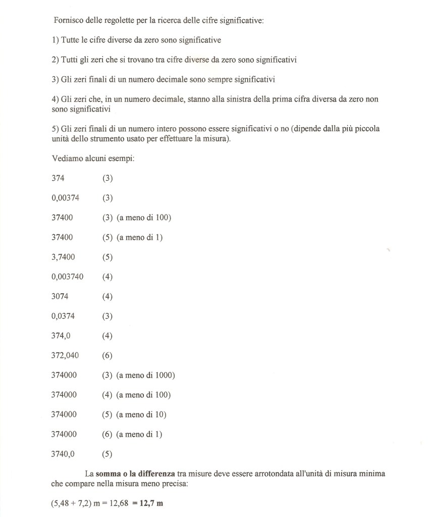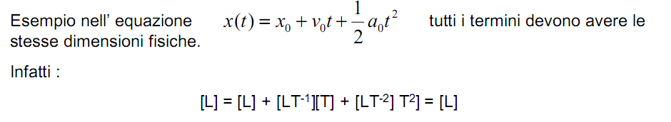 3) Non posso sommare o sottrarre fra loro grandezze fisiche di dimensioni diverse. Inoltre la dimensione della somma o sottrazione di due o più grandezze fisiche di stessa dimensione è la dimensione della grandezza stessa (in altri termini, se sommo [L] + [L] ho ancora [L], non 2.[L], mentre se moltiplico [L].[L] ho [L]2).