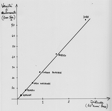 Da questa figura si può fare un conto a ritroso. Percorrendo “a marcia indietro” il cammino delle galassie, si può tentare di capire qual è stato il passato e datare l’ipotetica origine dell’universo (ultimamente l’ipotesi del big-bang ha perso forza e si sta tentando di capire cosa mettere al suo posto).