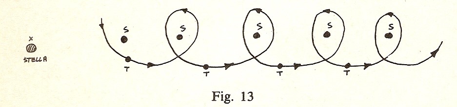 Se ci andiamo a sistemare poi su di una stella della galassia rispetto alla quale il Sole si allontana a velocità pressoché costante, allora troviamo che la traiettoria della Terra rispetto a noi, che siamo su questa stella, è rappresentata dalla fig. 13.