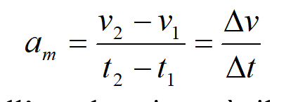 Quando la velocità istantanea di una particella varia nel tempo si dice che la particella accelera. L’accelerazione media am della particella in un intervallo di tempo Δt è il rapporto tra la variazione di velocità Δv = v2 – v1 ed il tempo: