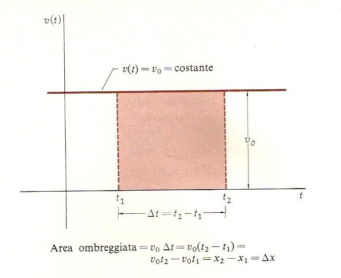 Nella figura si apprezza che la partenza della particella è al tempo t = 0 e noi consideriamo il suo moto fino al tempo t = t1. L’area ora in considerazione, quella che in un piano (v,t) ci fornisce lo spostamento x1, è: