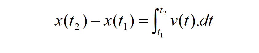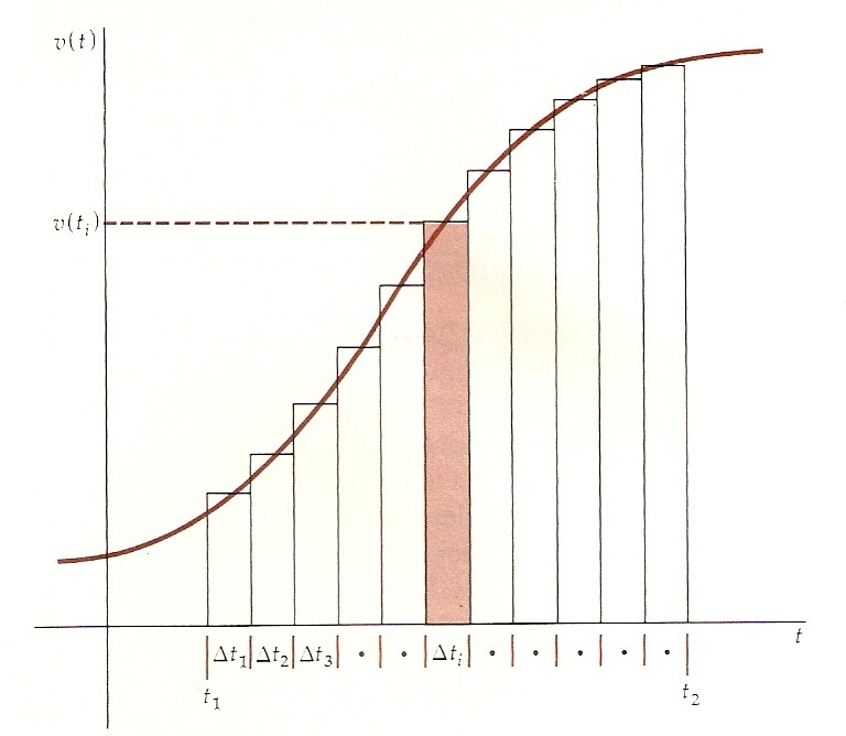 In questo caso per calcolare l’area sottesa tra la curva e l’asse delle ascisse da t1 a t2, dovremo suddividerla in tanti intervallini Δt e sommare tutte le aree. E’ però chiaro che l’area corretta si ha solo per la base Δt di ogni intervallino tendente a zero. In tal modo passiamo dalla sommatoria all’integrale definito (in questo caso è definito perché conosciamo gli estremi di integrazione t1 e t2). Avremo quindi: