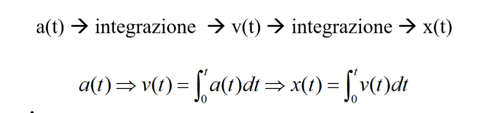 Abbiamo visto come dalla posizione x(t) sia possibile passare alla velocità v(t) e da questa all’accelerazione a(t). Il problema inverso è evidentemente il ricavare x(t) conoscendo v(t) o a(t). Si tratta di trovare una funzione della quale conosciamo la derivata e questo sappiamo che si fa attraverso l’operazione di integrazione indefinita. La funzione trovata è una primitiva della funzione data che, come sappiamo, contiene sempre una costante additiva che, in fisica, è legata alla scelta dell’origine del processo. Se, ad esempio, conosciamo la derivata della funzione in tutto l’intervallo di tempo preso in considerazione e conosciamo il valore della funzione in un punto, allora la funzione è determinata univocamente perché il valore della costante additiva si può ricavare dalle informazioni date sul valore della funzione in quel punto.