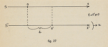 Chiamiamo ora S il sistema individuato dalla terna Oxyz ed S’ il sistema O’x’y’z’. Supponiamo poi che S’ si sposti, relativamente ad S (supposto in quiete), con velocità u. Poiché abbiamo semplificato il problema riportandolo ad una sola dimensione, non dobbiamo seguire gli spostamenti del corpo da studiare lungo gli assi y (e y’) e z (e z’); dovremo solo studiare le sue posizioni e velocità sugli assi x ed x’. Pertanto sarà sufficiente riportare in figura solo le posizioni relative dell’asse x e dell’asse x’. In definitiva, dopo un tempo t = t’ = 0, i due sistemi saranno situati, l’uno rispetto all’altro, come riportato in fig. 27 (anche qui i due assi, che dovrebbero coincidere per le ipotesi iniziali, sono stati disegnati l’uno splittato rispetto all’altro). Il tratto d che in figura separa O da O’ è il tratto che il sistema S’ percorre, marciando alla velocità u, nel tempo t (o t’), cioè: d = u t (oppure d = u t’).