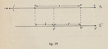 L’esempio visto può essere letto in altro modo, in accordo con il principio di relatività, e cioè si può pensare il sistema S’ in quiete mentre il sistema S è in moto rettilineo uniforme a velocità u in verso opposto (cioè a velocità – u). Si può allora pensare la particella in moto su S’ e chiedersi cosa osserviamo su S. La situazione è illustrata in fig. 29