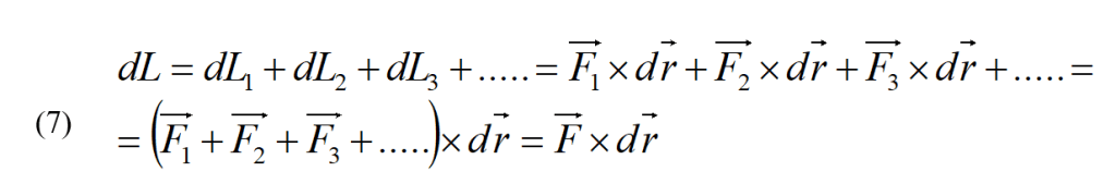 Osserviamo che dr è lo stesso per tutte le forze, poiché tutte agiscono sulla stessa particella. Il lavoro totale dL compiuto sulla particella si ottiene sommando i lavori infinitesimi dL1, dL2, dL3, … , compiuti da ciascuna forza. Allora: