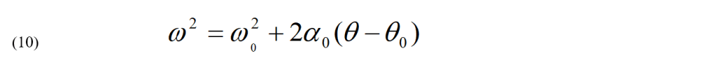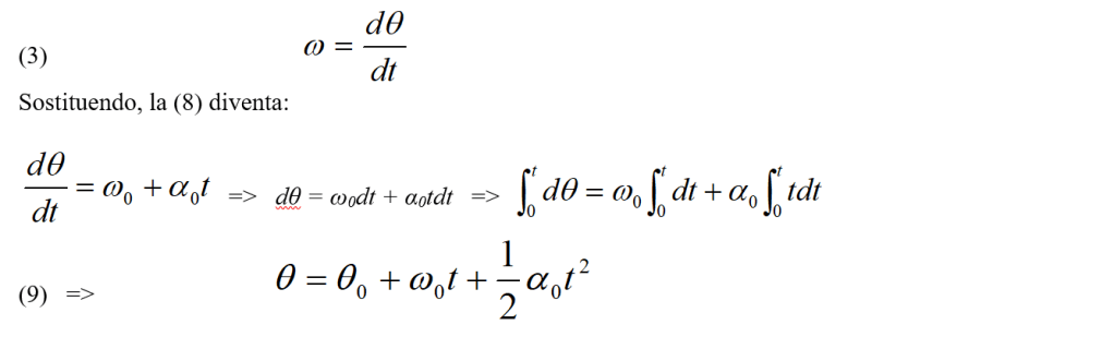 Come nel caso delle formule per l’accelerazione lineare costante, si può eliminare il tempo da queste equazioni per ottenere un’equazione che leghi lo spostamento angolare, la velocità angolare e l’accelerazione angolare (dalla 8 si ricava il tempo t che si sostituisce nella 9; da qui, risolvendo con banale algebra, si trova):