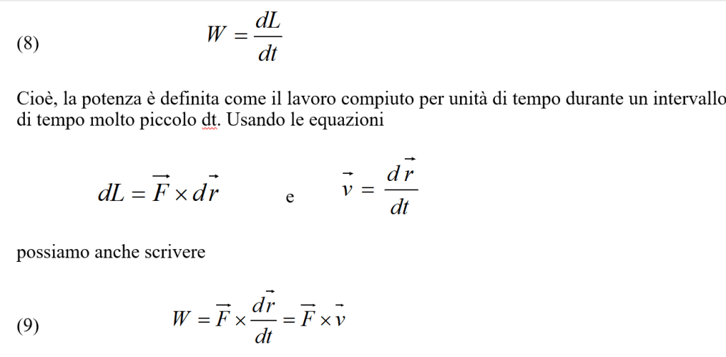 e così la potenza si può anche definire come il prodotto della forza per la velocità. La potenza media durante un intervallo di tempo t si ottiene dividendo il lavoro totale L, dato dalla (4), per il tempo t, ottenendo così Wmed = L/t.