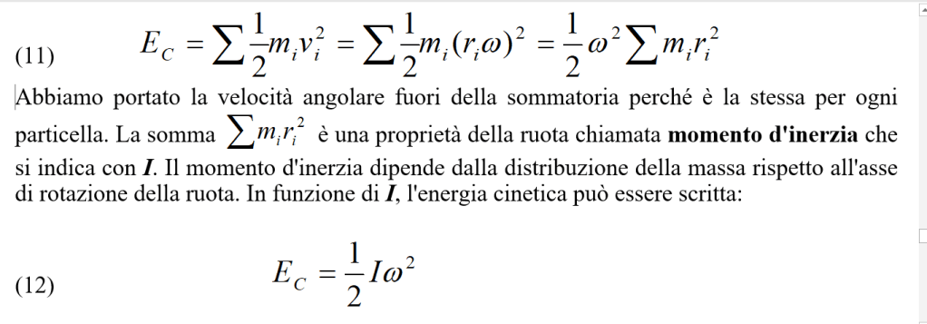 L’energia cinetica di un sistema di particelle è semplicemente la somma delle energie cinetiche delle singole particelle. Per una ruota in rotazione, si ha: