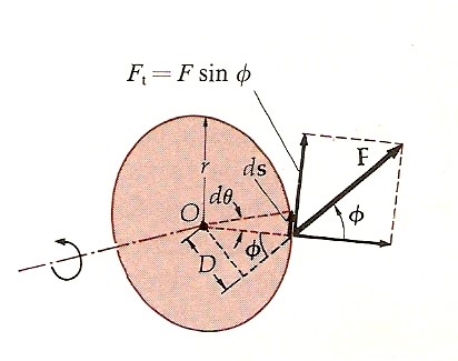 La forza forma un angolo φ con la linea radiale condotta dall’asse di rotazione al punto di applicazione della forza. La componente tangenziale della forza è Ft = F sin φ. (usiamo φ per evitare che questo angolo sia confuso con l’angolo di rotazione θ). In un tempo dt, la ruota gira di un angolo dθ = ω dt. Il punto di applicazione della forza percorre una distanza ds = r dθ = rω dt. Il lavoro compiuto dalla forza è perciò: