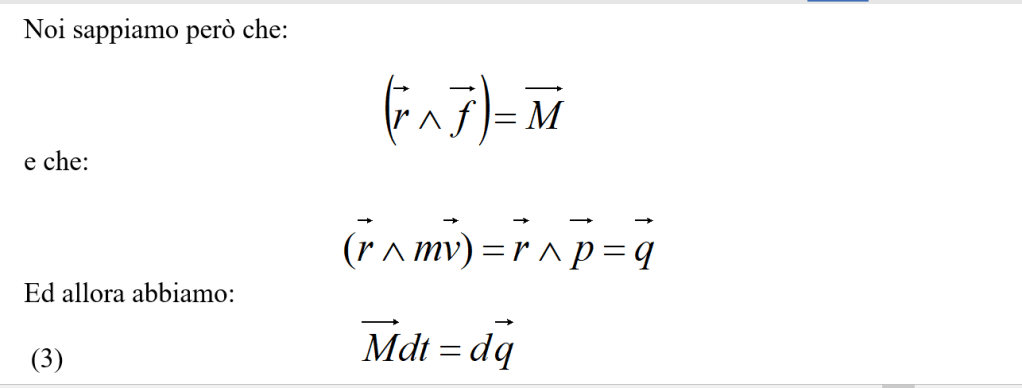 Alla quantità M.dt si dà il nome di momento dell’impulso della forza applicata ad un punto materiale: esso risulta uguale a dq, cioè alla variazione del momento della quantità di moto del medesimo punto materiale.