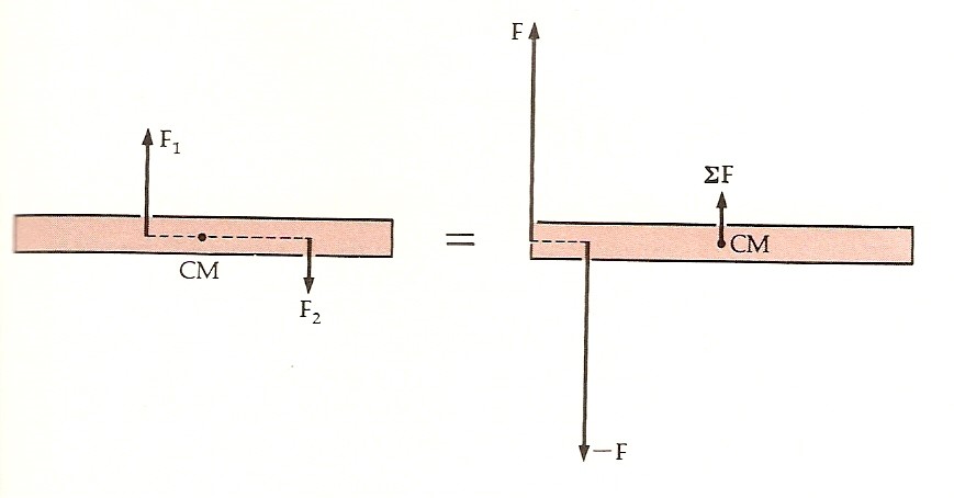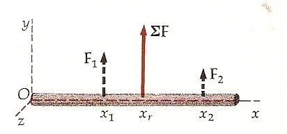 Nel fornire esempi dell’applicazione di queste condizioni vorremo spesso sostituire due o più forze agenti su un corpo con un’unica forza equivalente. Quando due forze F1 ed F2 agiscono su un’asta come nella figura seguente, l’unica forza che ha lo stesso effetto sulla traslazione del centro di massa del corpo è la somma Σ F = F1 + F2.