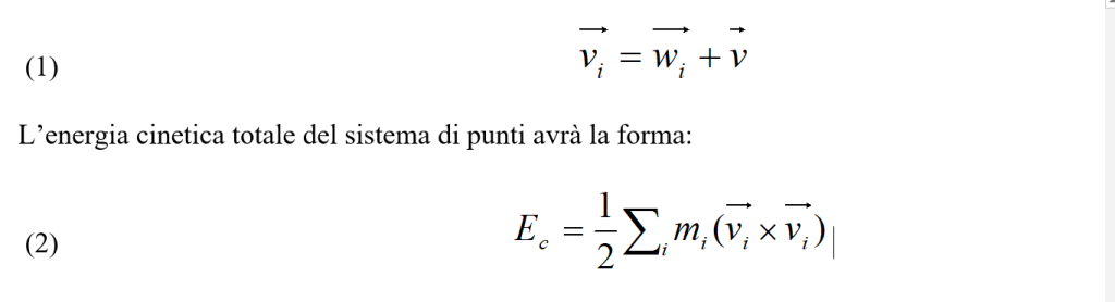 Sia G il baricentro di un sistema di punti in moto rispetto ad un sistema inerziale e sia v la velocità di G rispetto a tale riferimento. Si indichi con vi la velocità di un generico punto Pi del sistema- Si consideri ora una terna di riferimento con l’origine in G e gli assi orientati verso direzioni fisse. Detta wi la velocità di Pi rispetto a questa terna, dalla cinematica dei moti relativi si ricava: