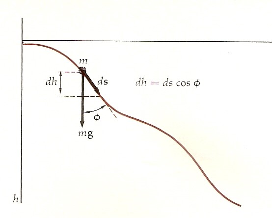 I risultati di questo esempio possono essere generalizzati. Si consideri una particella che scende strisciando lungo una curva di forma qualsiasi sotto l’influenza della gravità. La figura seguente indica un piccolo spostamento ds parallelo alla curva.