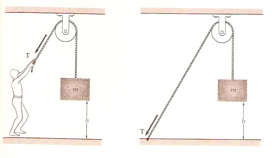 Nel linguaggio quotidiano, si dice che bisogna eseguire un lavoro per far questo: si deve esercitare una forza, che stanca i muscoli; ma nella nostra definizione scientifica, nessun lavoro è eseguito da una forza che agisce su un corpo fermo. Si potrebbe eliminare lo sforzo di sostenere il peso legando semplicemente la fune a qualche oggetto fisso, e il blocco sarebbe sostenuto senza che si debba intervenire in alcun modo. Allo stesso modo, una persona che trasposti una pesante valigia su un marciapiede orizzontale piano, non fa alcun lavoro fisico (la forza risulta perpendicolare allo spostamento)ma fatica molto. È utile considerare il lavoro, così come è stato definito, come una grandezza di cui deve essere pagato lo scotto in qualche modo. Il pagamento avviene mediante qualche tipo di perdita di energia da parte di qualunque agente che eserciti la forza. Per esempio, non si può sollevare il peso della figura a un’altezza maggiore se non si fornisce energia in una forma o in un’altra. Se si attacca un peso lievemente più grande alla fune e si solleva il peso iniziale lasciando cadere il secondo peso, si paga con la perdita di energia potenziale del secondo peso. Se si solleva semplicemente il peso con i muscoli, si paga lo scotto del lavoro eseguito con la perdita di energia chimica interna del corpo. Per continuare a eseguire lavoro con i muscoli, si deve finire per ripristinare questa energia con l’assunzione di nutrimento. Se si attacca la fune a un motore elettrico per sollevare il peso, si spende energia elettrica per eseguire questo lavoro.