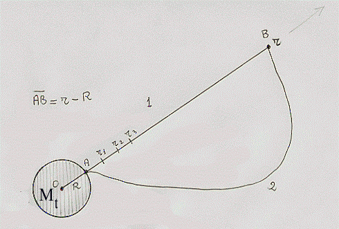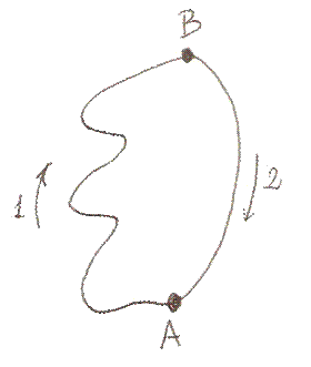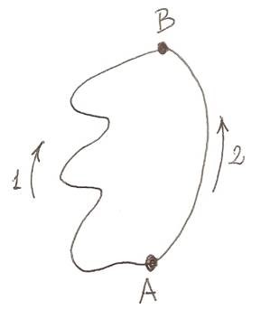 Si definisce conservativo un campo di forze quando il lavoro fatto per spostarsi tra due punti A e B di esso è indipendente dal cammino percorso (il campo è conservativo solo quando in esso agiscono forze conservative come quella gravitazionale o elettrostatica). Dietro questa definizione vi è un fatto semplice. Supponiamo che da un paesino A a fondovalle si voglia raggiungere una cima B. Tale cima, come si sa, è raggiungibile per varie vie, da quella per principianti a quella per esperti scalatori. L’una sarà una passeggiata che si servirà di molti tornanti, l’altra punterà a perpendicolo verso la cima. Ambedue, il principiante e lo scalatore, faranno un lavoro per andare da A a B. Nel caso del principiante si avrà l’applicazione media di una forza minore ma il tragitto è più lungo; nel caso dello scalatore vi sarà l’applicazione di una forza maggiore per un tragitto però più breve. Si tratta di capire quale lavoro è maggiore se ve ne è uno maggiore. La cosa non è priva di senso, semplicemente perché, ad esempio, dovendo costruire una strada si tenterà sempre di farlo lungo il preteso tragitto in cui il lavoro sia minimo. Fin qui mi sono riferito al campo gravitazionale. Stesse cose si possono dire per campi elettrici, magnetici, elettromagnetici, … evidentemente con esemplificazioni diverse. Rappresentiamo con un disegno i due punti A e B uniti da due tragitti, l’1 ed il 2 che ci permettono di andare da un punto all’altro secondo il verso delle frecce (Fig. 1).