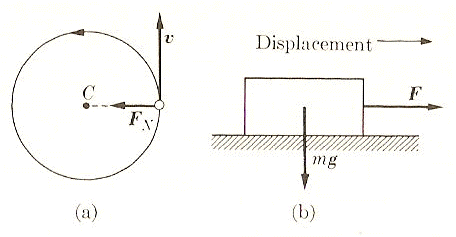 Osserviamo che, se la forza è perpendicolare allo spostamento (θ = 90°), il lavoro compiuto dalla forza è nullo. Per esempio, questo è il caso della forza centripeta Fc nel moto circolare (figura a) o della forza di gravità mg quando un corpo si muove su di un piano orizzontale (figura b).
