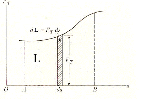 Il lavoro dL = FT.ds compiuto durante un piccolo spostamento ds, corrisponde all’area del rettangolo stretto. In tal modo possiamo trovare il lavoro compiuto sulla particella per spostarla da A a B, dividendo dapprima l’intera area tratteggiata della figura in tanti rettangoli stretti, e sommando poi le loro aree. Cioè, il lavoro totale compiuto è dato dall’area totale sottesa dalla curva, dall’asse s e dai segmenti di perpendicolare tracciati dagli estremi considerati della curva e l’asse s.