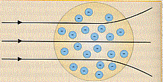 La pasticca del radio emette, fra l’altro, radiazioni a, cioè particelle formate tra l’altro da due protoni (nuclei di elio: He2+). Queste particelle escono a gran velocità dalla fenditura F e vanno ad urtare ed attraversare la lamina d’oro. A quell’epoca si aveva a disposizione il modello atomico di Thomson ed un pezzo di materia, costituito da questi atomi era pensato molto compatto (vedi la figura (a)):